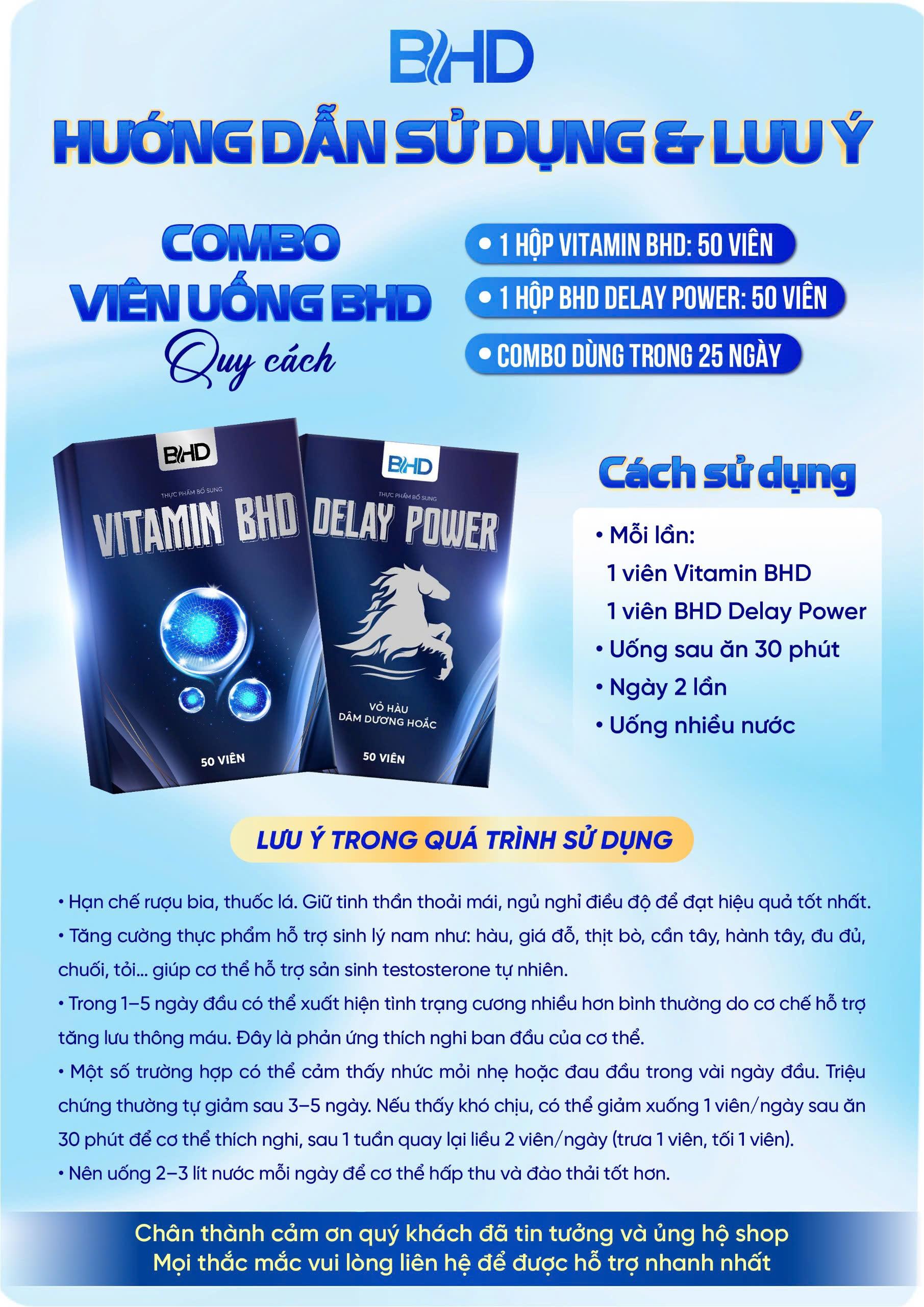 Anh em nam giới hãy sử dụng sản phẩm Bổ Hoàn Dương mỗi ngày 2 lần, mỗi lần 1 viên BHD Delay và 1 viên Vitamin Hàu Sau khi ăn là đủ.